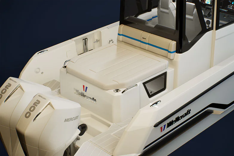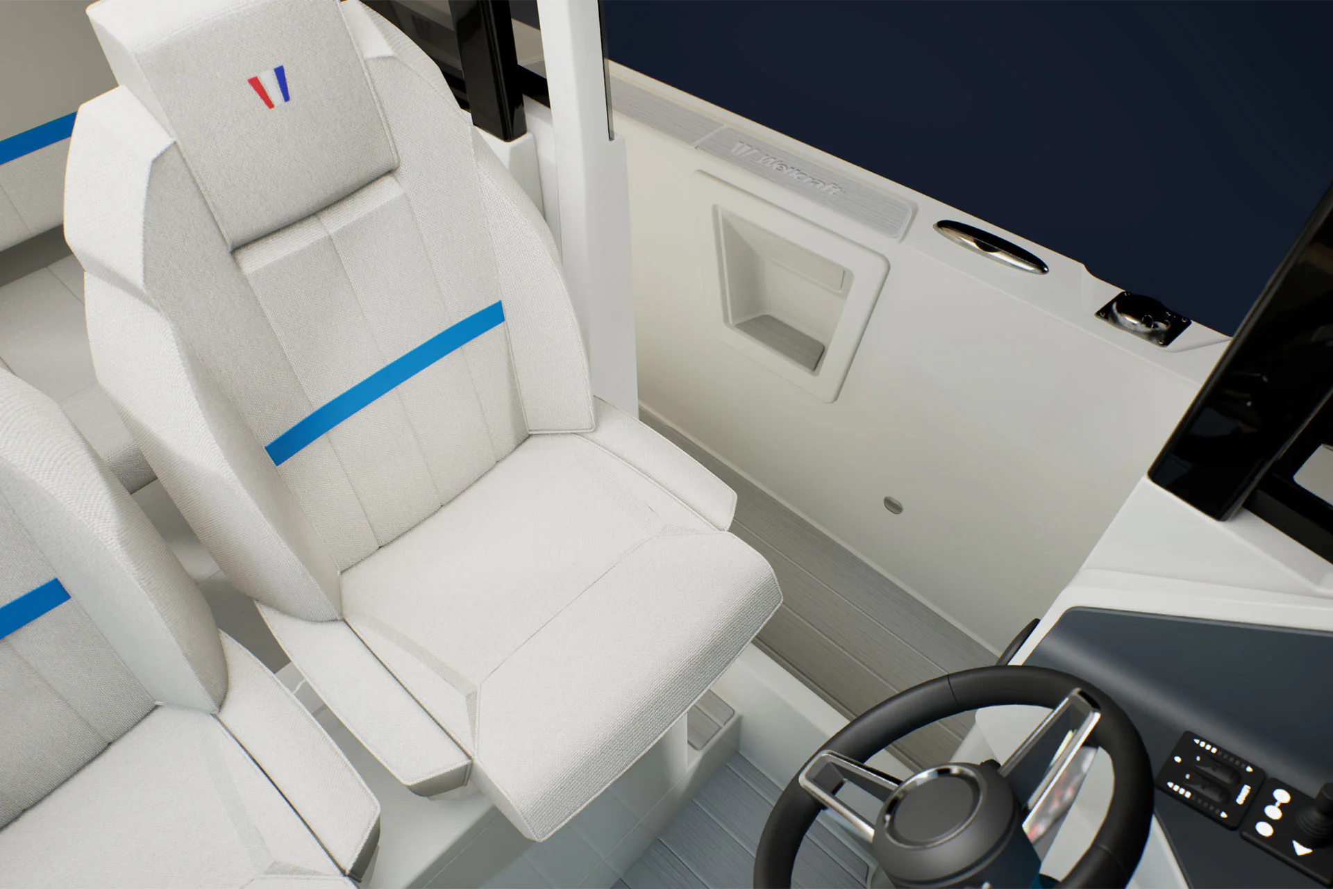 Inside the Wellcraft 28 Explorer, every feature is built to support long-distance trip and all-season cruising. The fully enclosed wheelhouse offers protection from the elements while maintaining panoramic visibility through the wraparound glass, creating a secure and stylish command center.