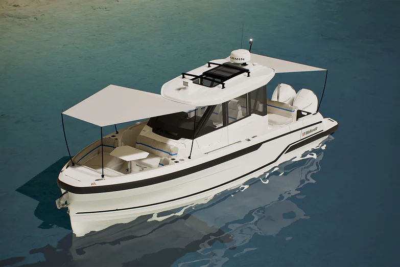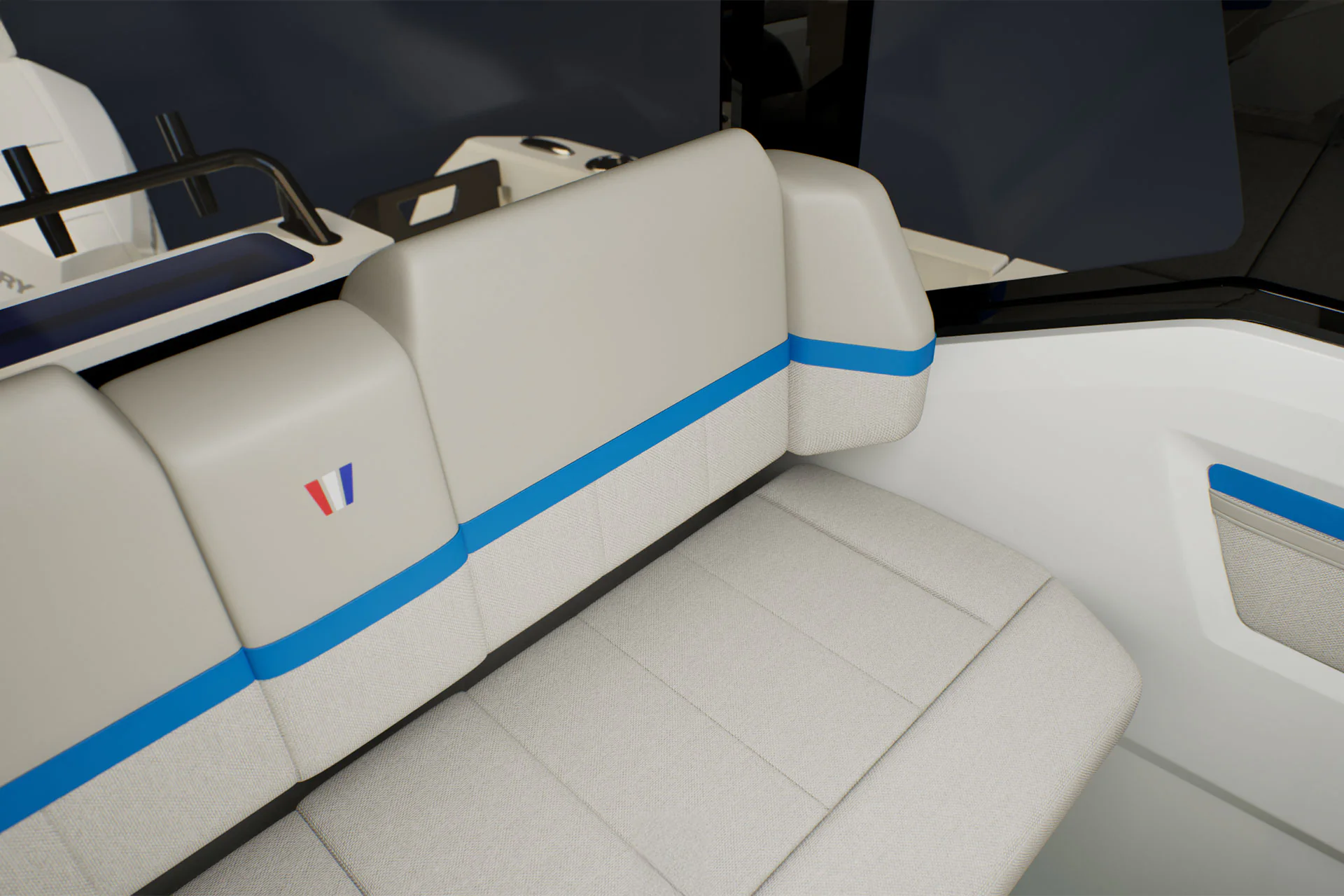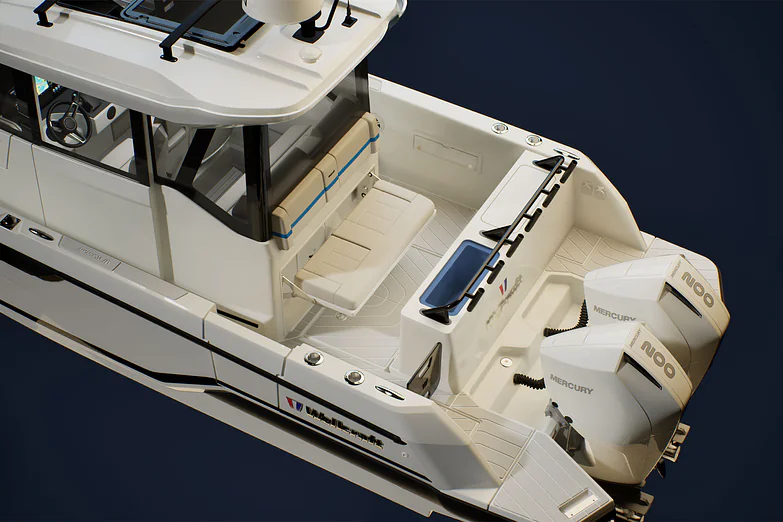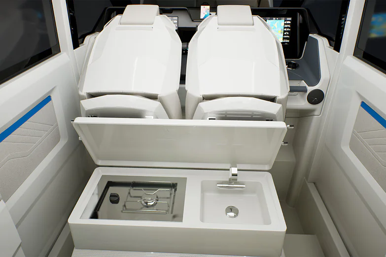 The Sleeper Aft Cockpit layout expands the boat’s overnight capacity. It features two additional berths cleverly integrated into the cockpit, allowing for more room to share the ride with friends or family. This smart configuration is paired with modular lounging areas, offering both relaxation and functionality.