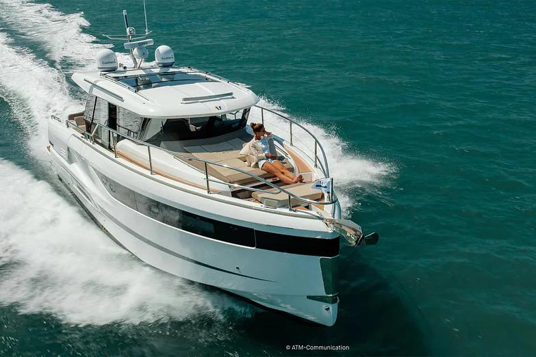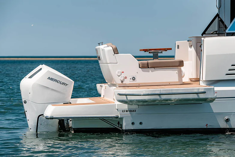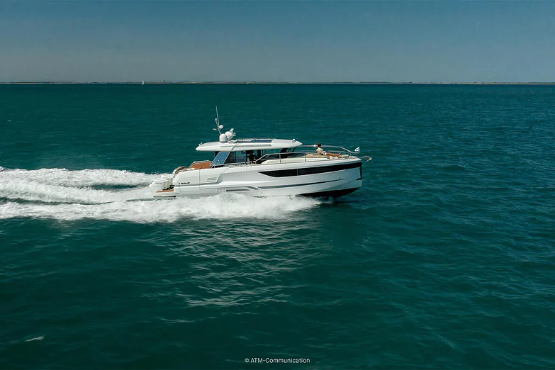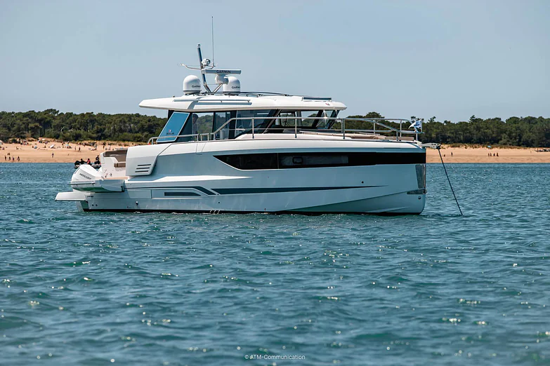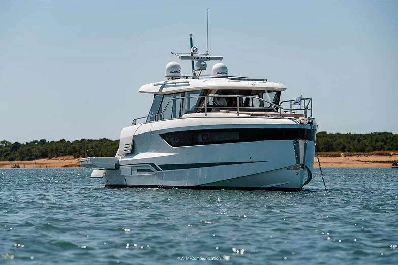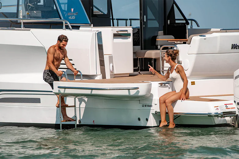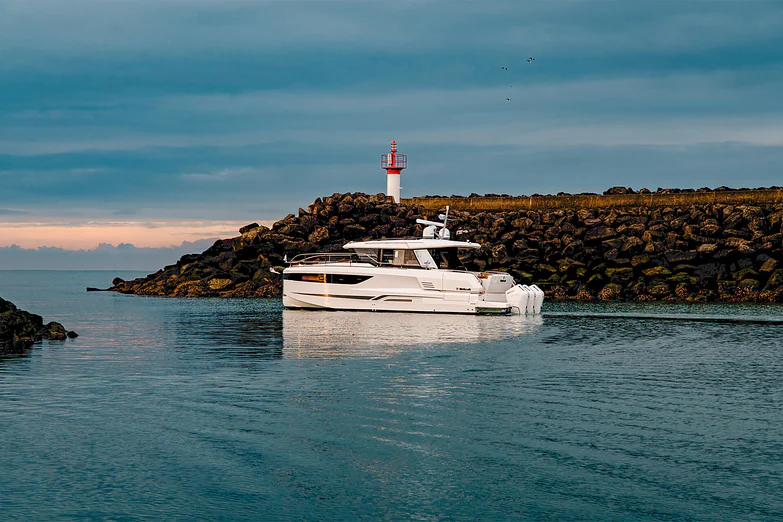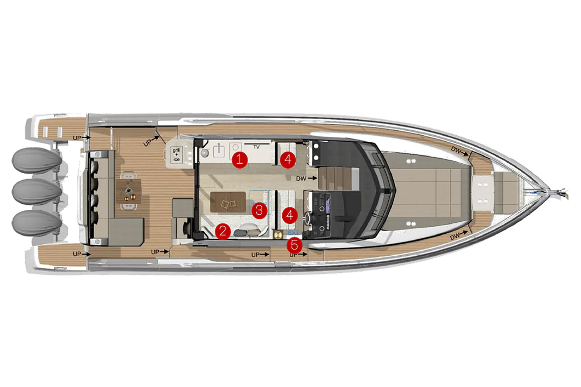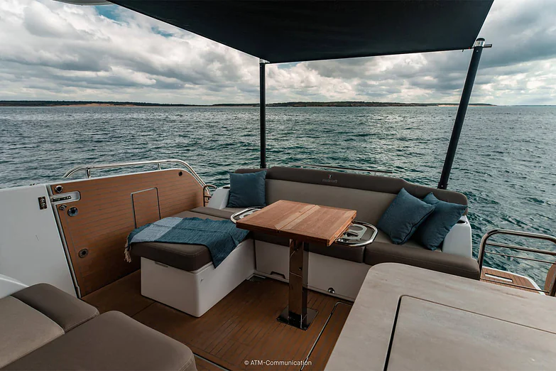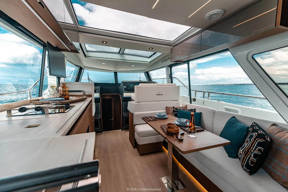 At deck level, the fully equipped galley connects seamlessly to the aft cockpit, creating a fluid living space ideal for entertaining or relaxing after a day of exploration. The protected wheelhouse includes helm station seating for pilot and copilot, offering a commanding view and a secure environment in all conditions.