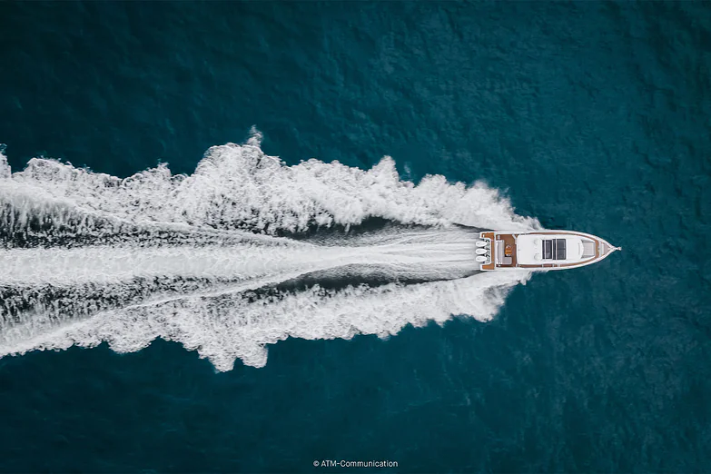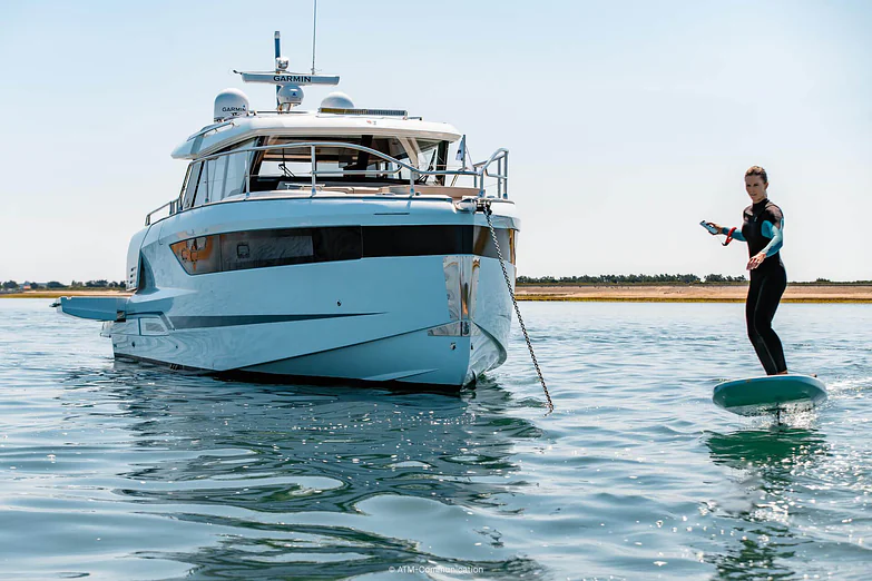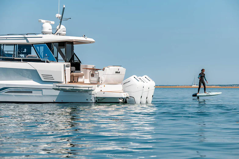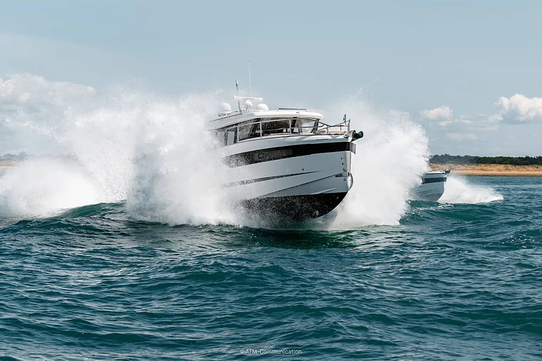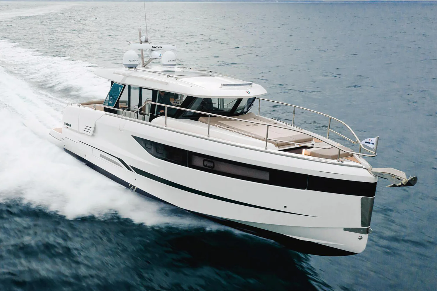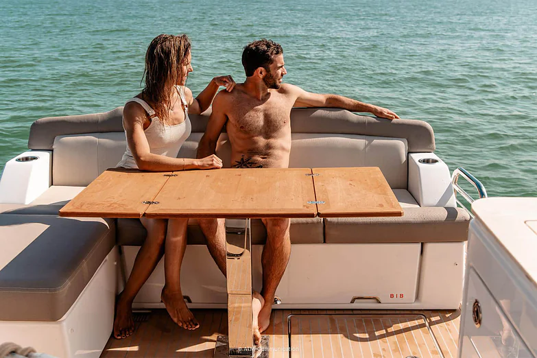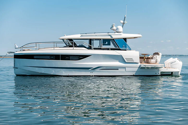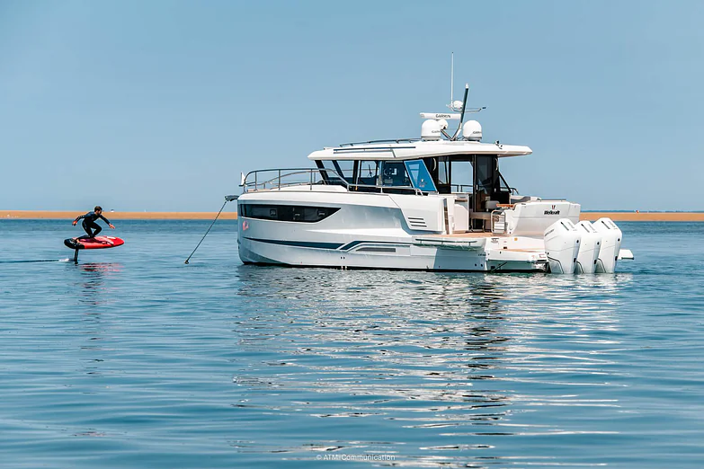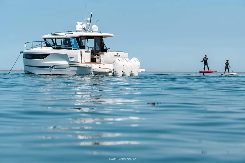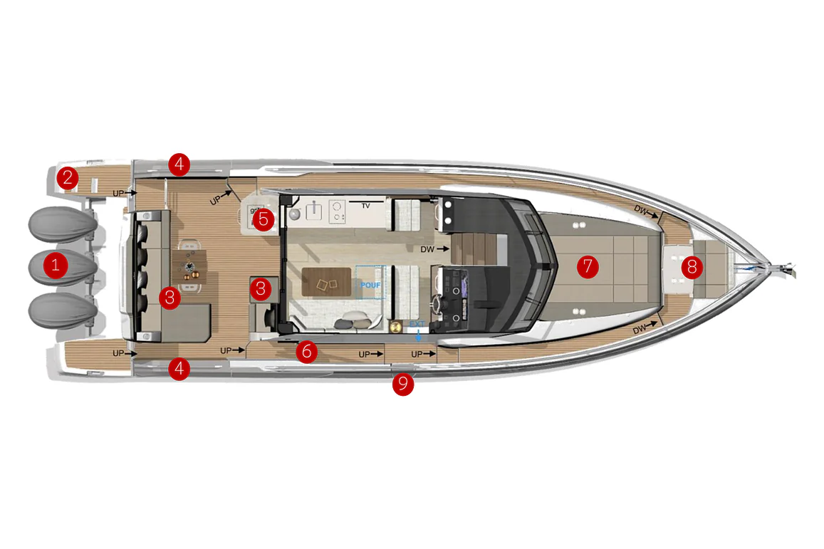 At deck level, the fully equipped galley connects seamlessly to the aft cockpit, creating a fluid living space ideal for entertaining or relaxing after a day of exploration. The protected wheelhouse includes helm station seating for pilot and copilot, offering a commanding view and a secure environment in all conditions.