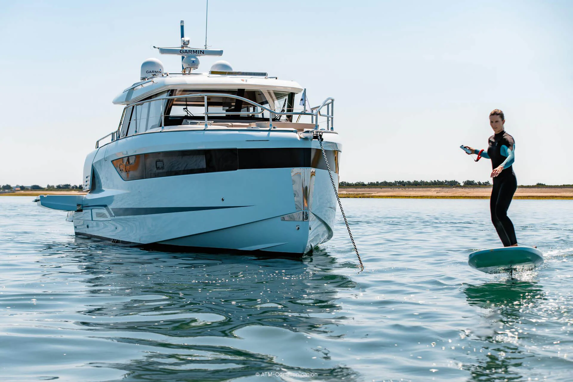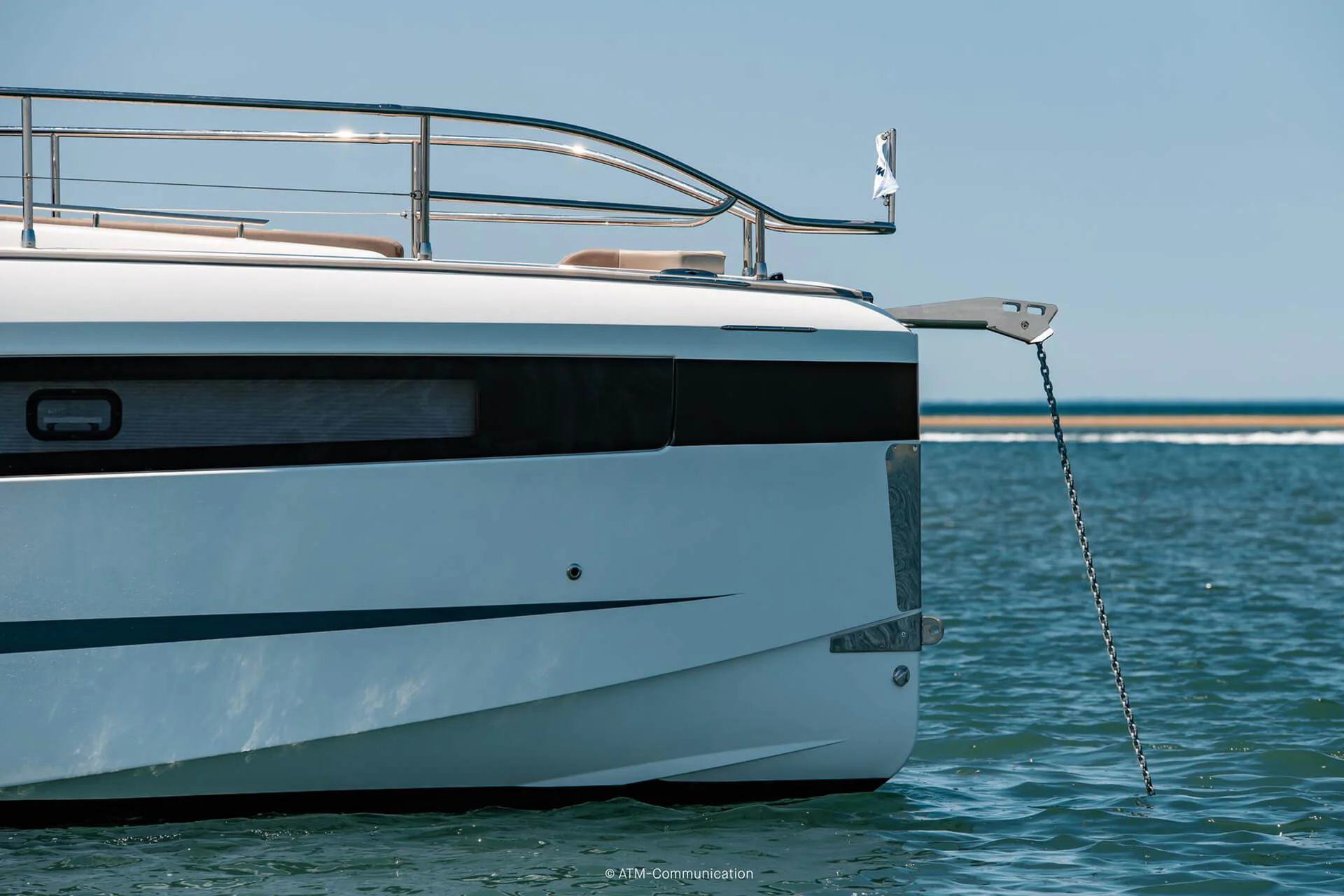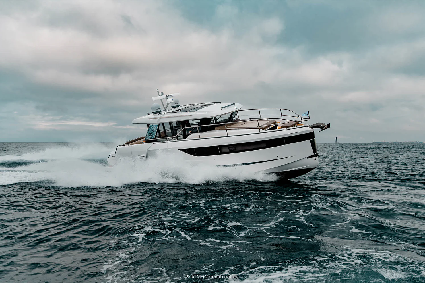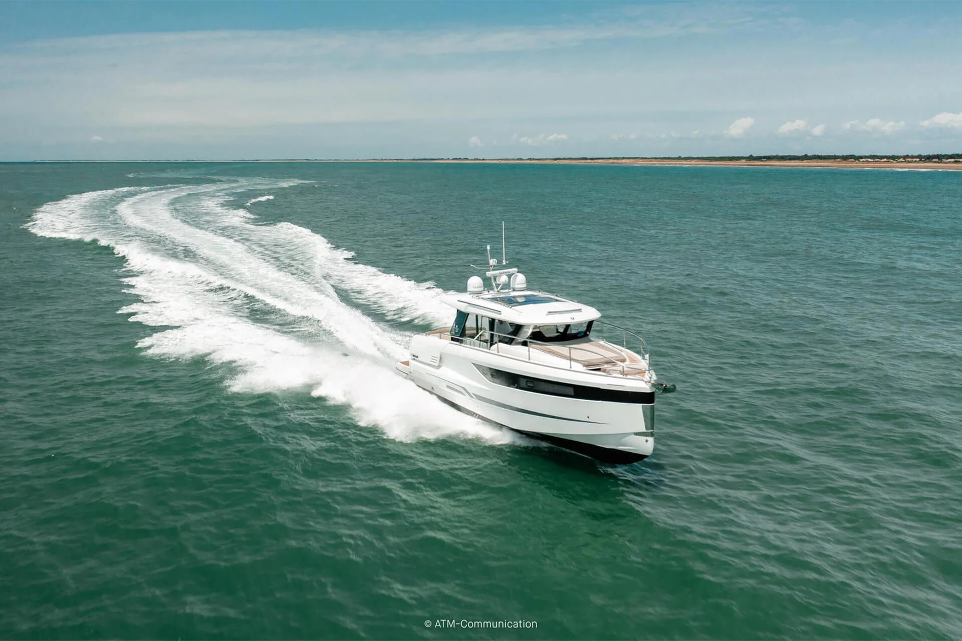 At deck level, the fully equipped galley connects seamlessly to the aft cockpit, creating a fluid living space ideal for entertaining or relaxing after a day of exploration. The protected wheelhouse includes helm station seating for pilot and copilot, offering a commanding view and a secure environment in all conditions.