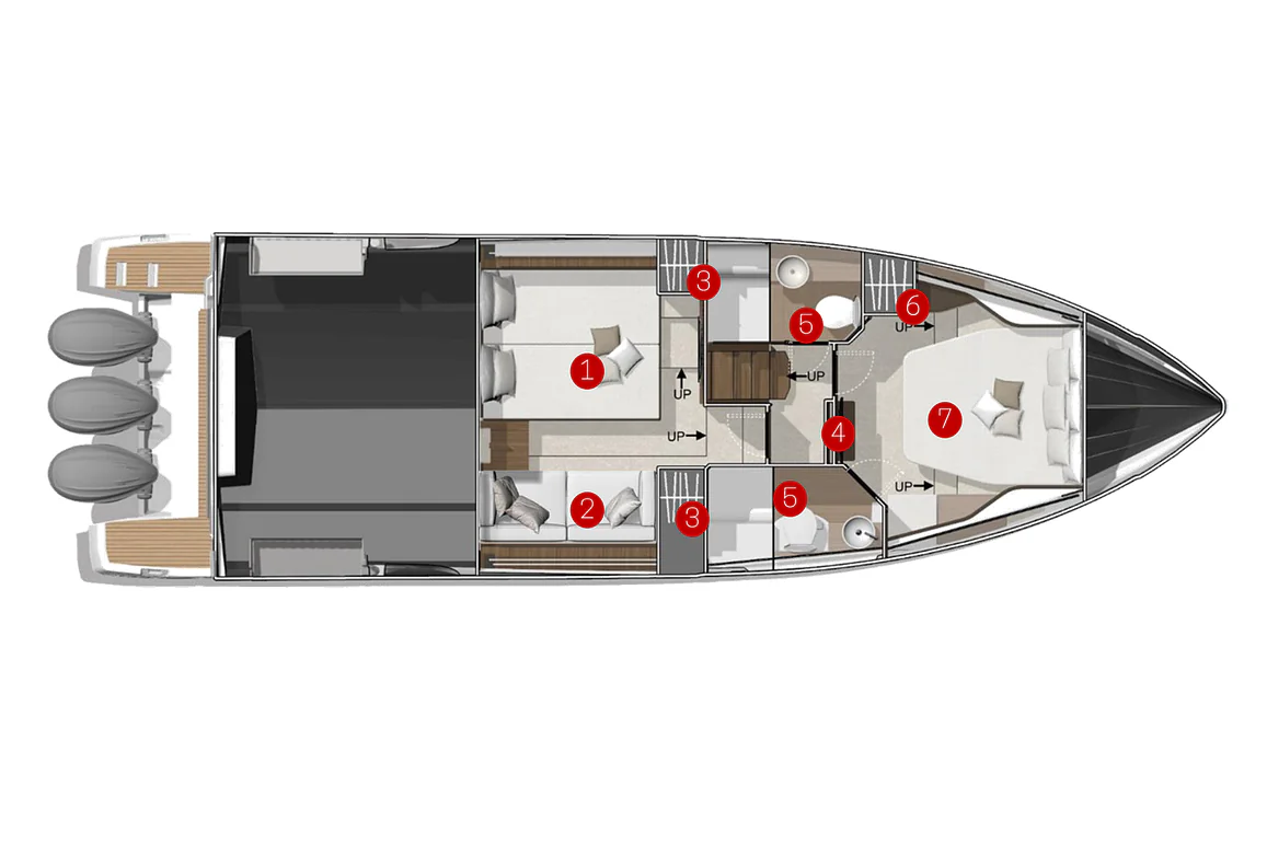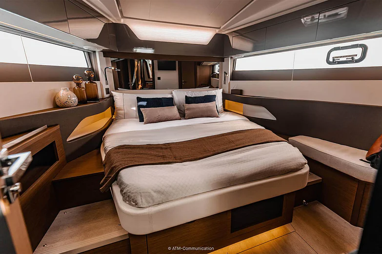 Both spacious cabins feature king-size beds with ensuite bathrooms including separate shower stalls, providing accommodation for up to five people. Whether you're on a weekend getaway or an extended expedition, the layout ensures privacy, comfort, and seaworthy reliability.