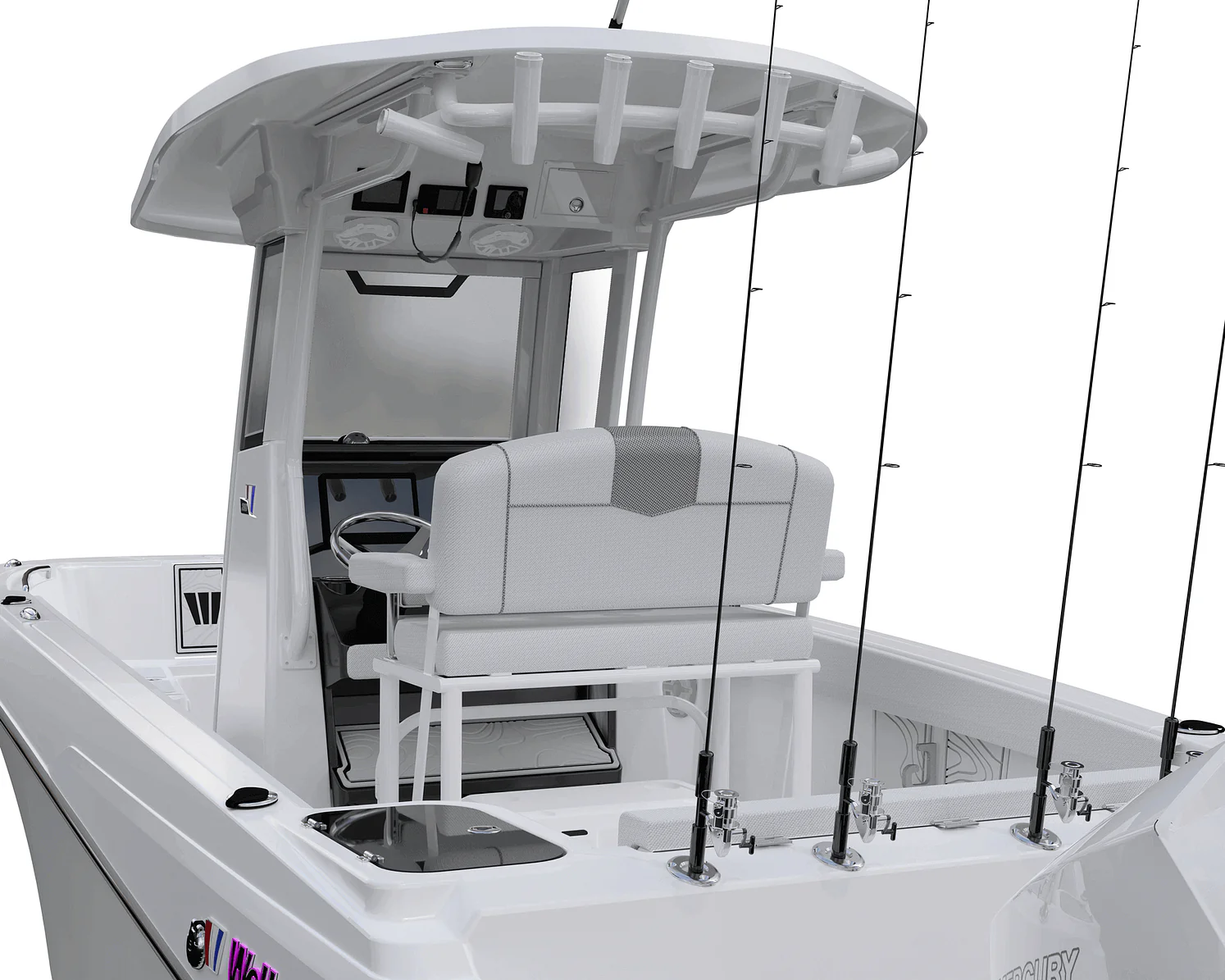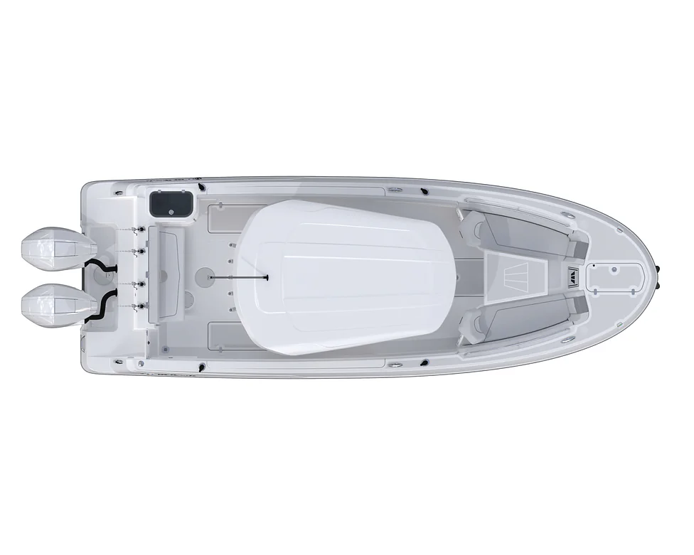 At the helm, the driver-centric driving position features intuitive controls, a large dash capable of accommodating dual displays, and a protective windscreen that enhances comfort during long runs. The updated hardtop provides shade and protection, while integrated rod storage, cup holders, and an easy-access head compartment to support longer days offshore.