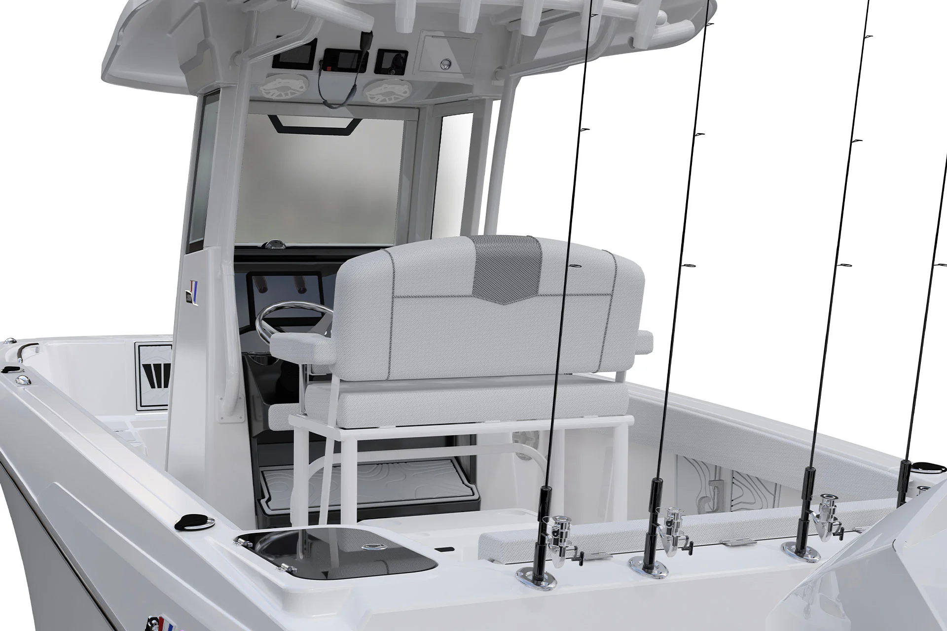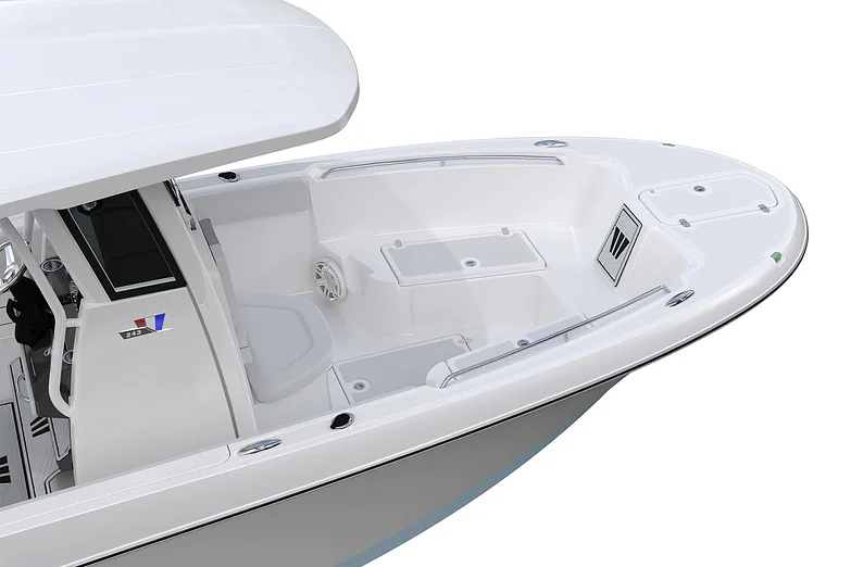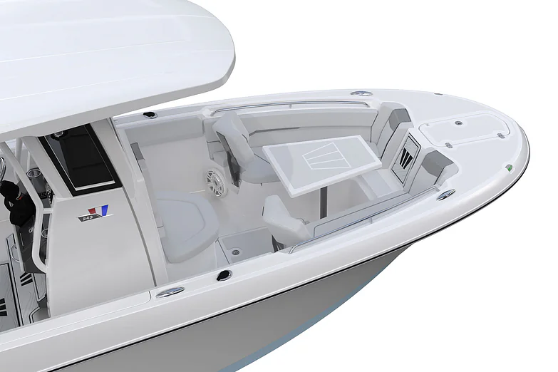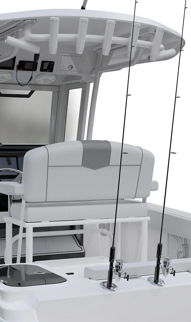 Step inside and discover a smartly designed interior that blends functionality with comfort. The ergonomic helm station features intuitive controls, a large dash for dual displays, and a protective windscreen for comfort during high-speed runs.