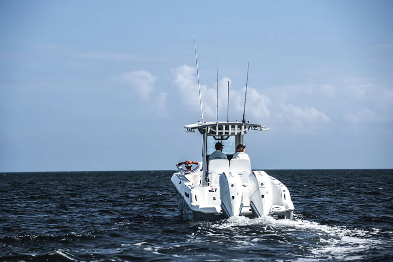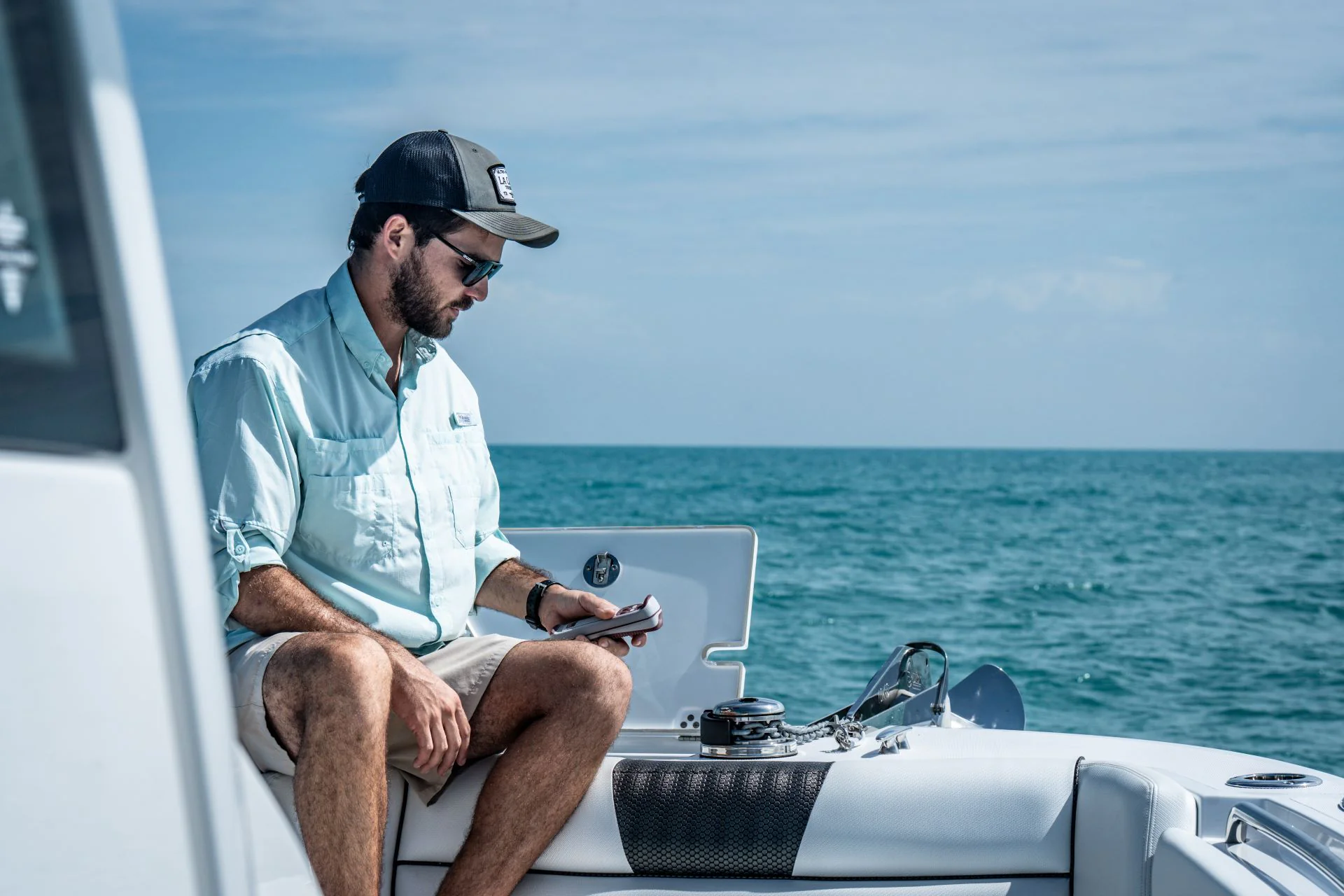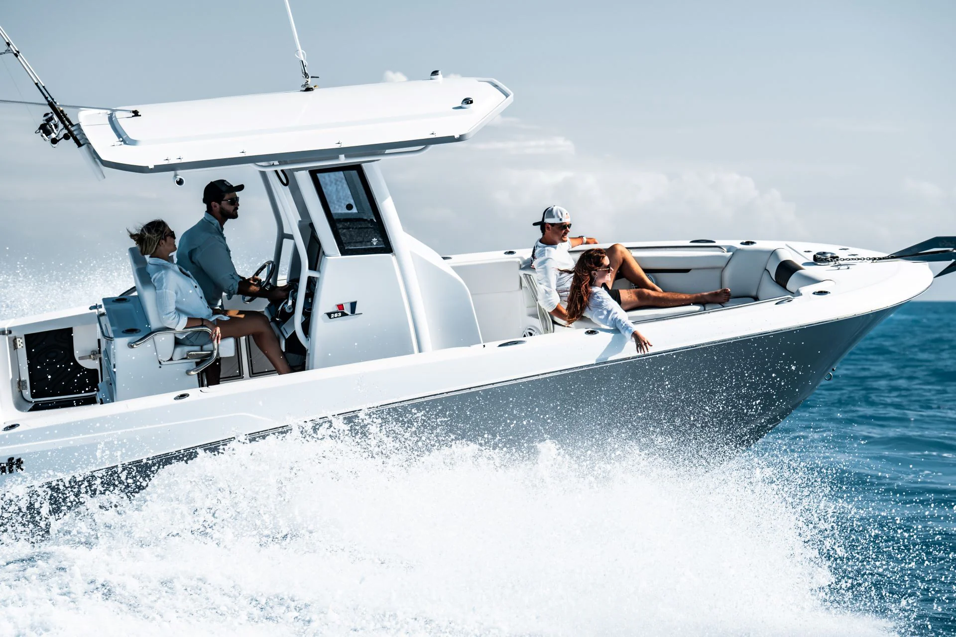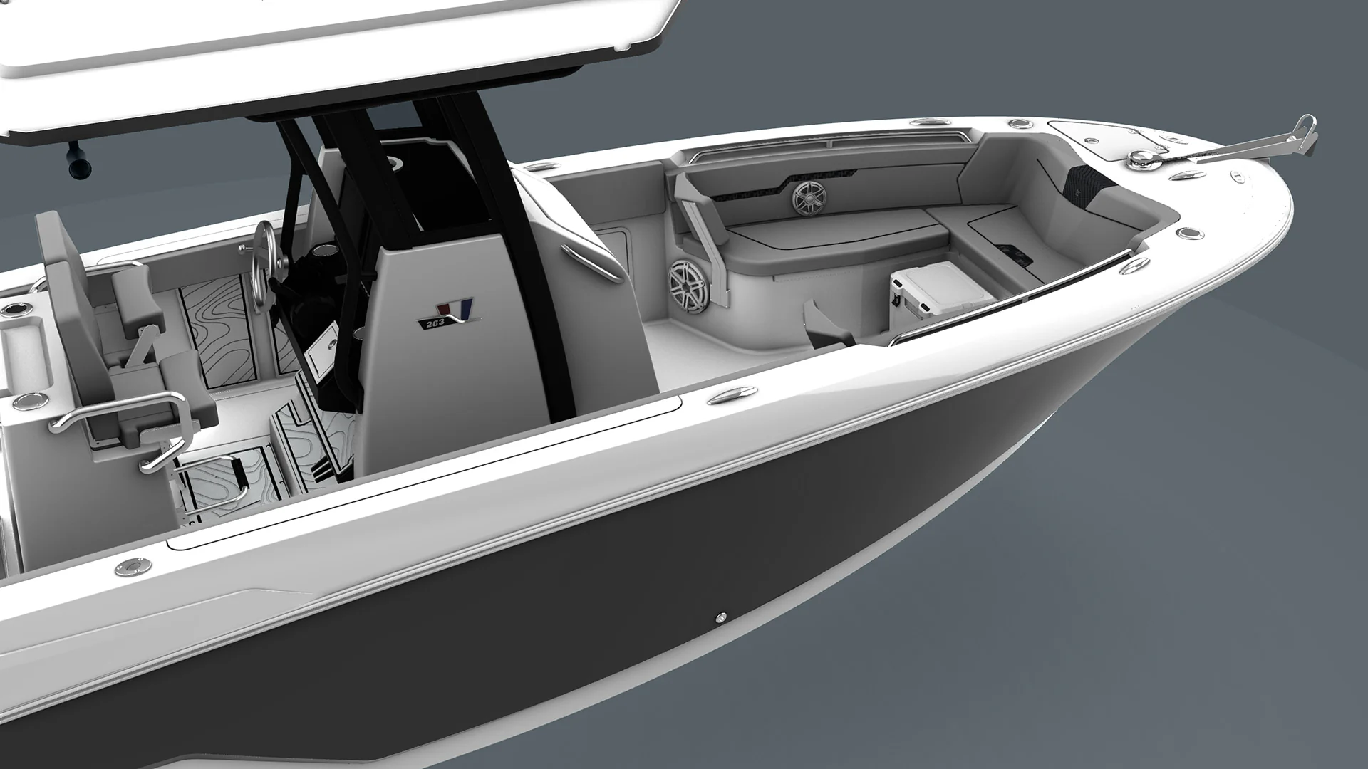Step aboard and experience a thoughtfully designed interior that blends functionality with comfort. The ergonomic helm station features intuitive controls, a large dash for dual displays, and a windscreen for protection during high-speed runs.