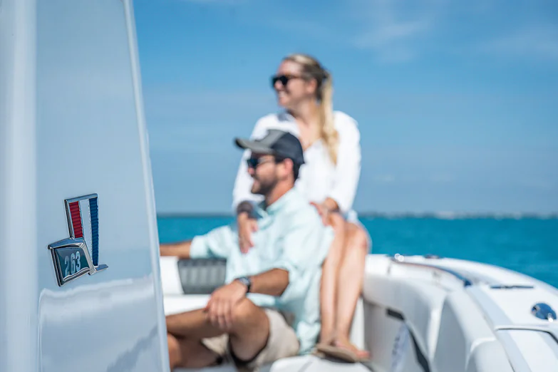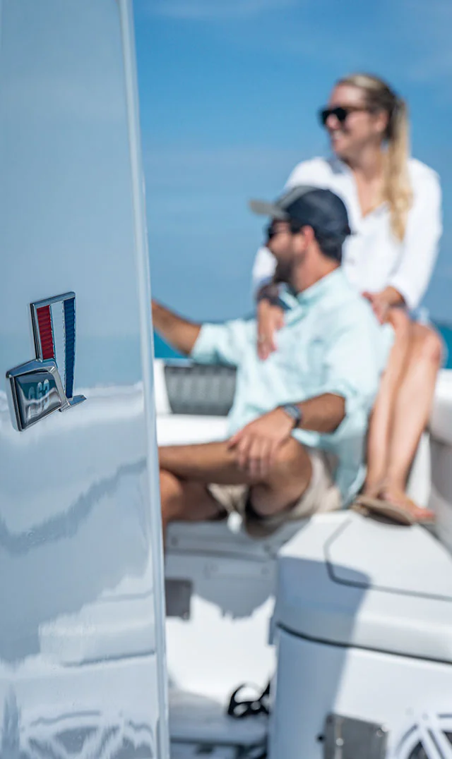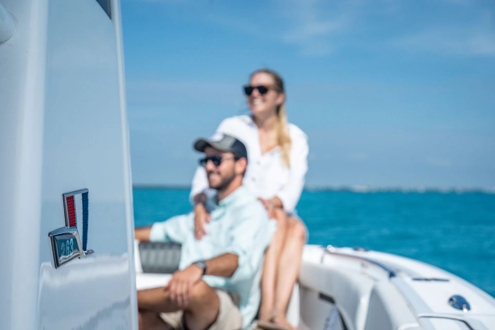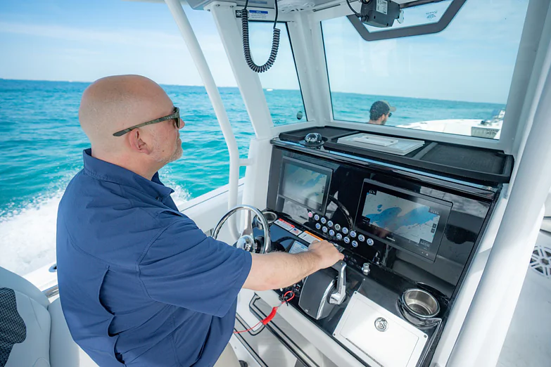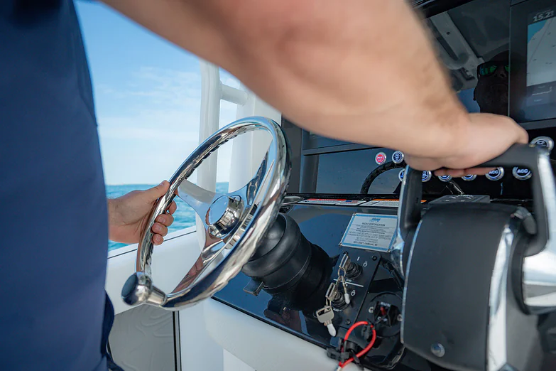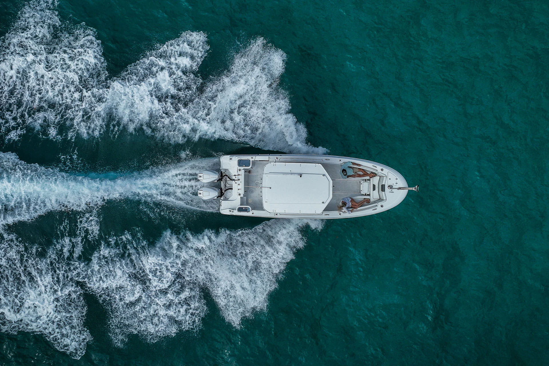 Step aboard and experience a thoughtfully designed interior that blends functionality with comfort. The ergonomic helm station features intuitive controls, a large dash for dual displays, and a windscreen for protection during high-speed runs.