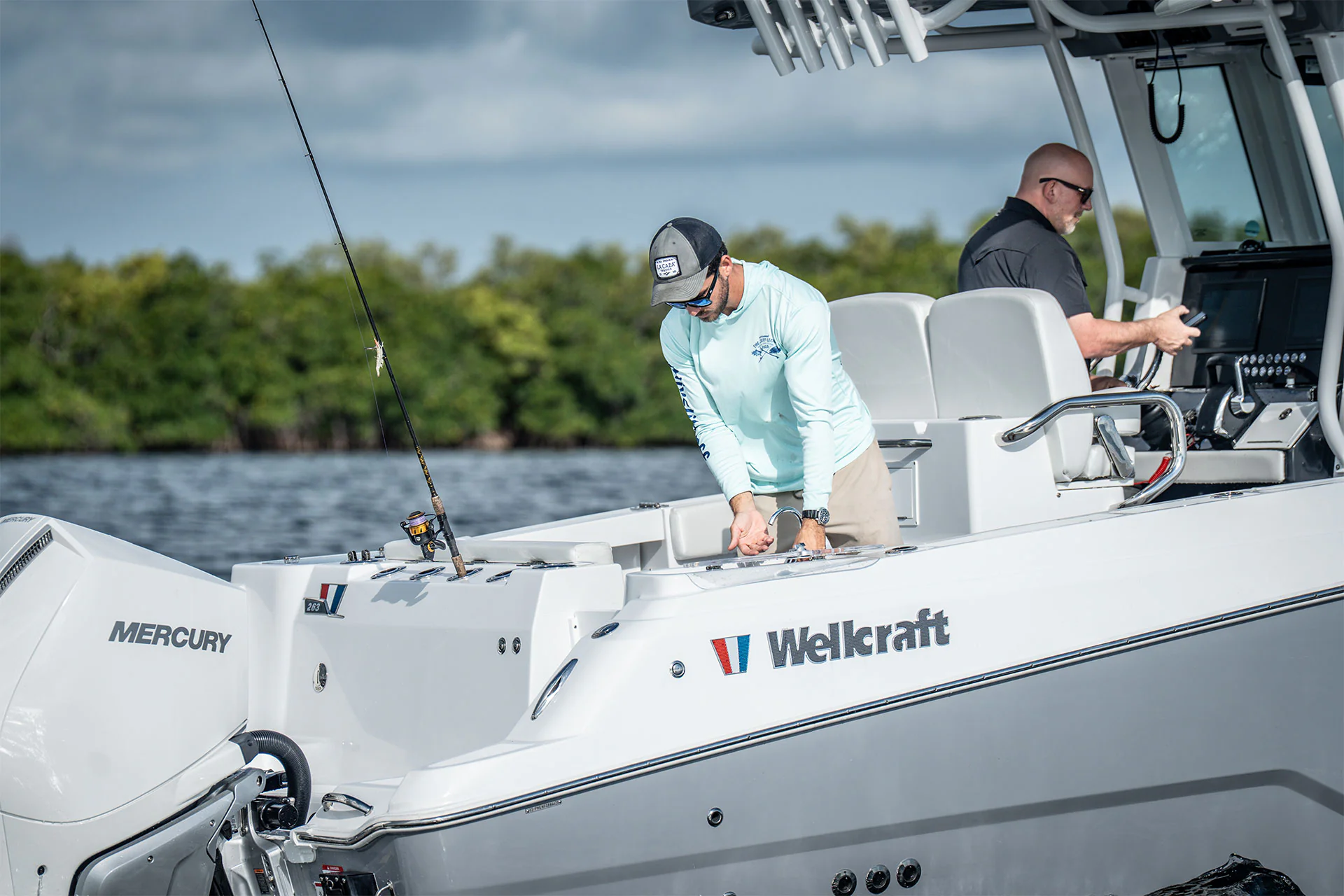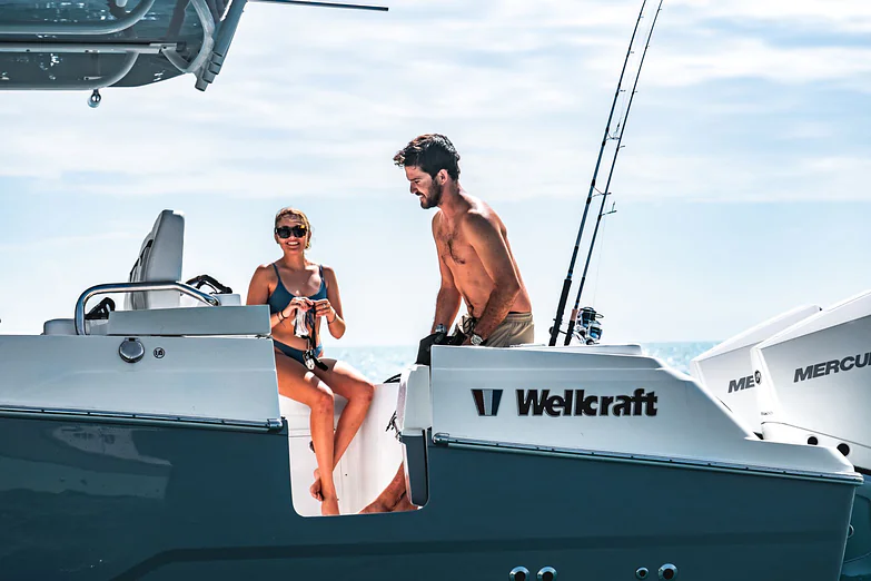 Forward and aft, versatile social zones adapt to your needs, whether you’re hosting friends, relaxing with family, or preparing for a big catch. Integrated coolers, foldaway seating, and a fully enclosed head compartment elevate convenience on long days at sea. Every detail, from smart storage solutions to premium upholstery, reflects Wellcraft’s commitment to performance-driven design.