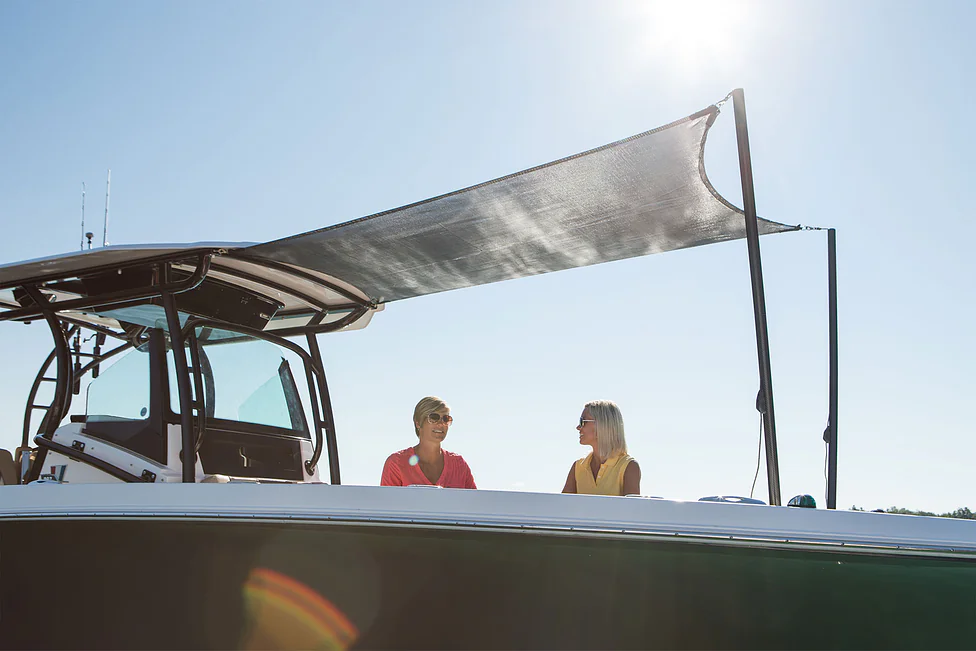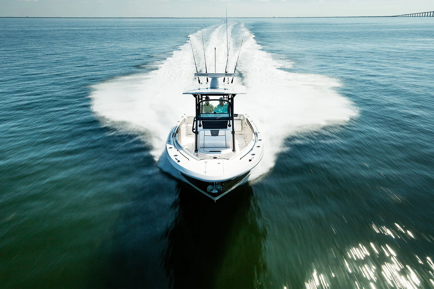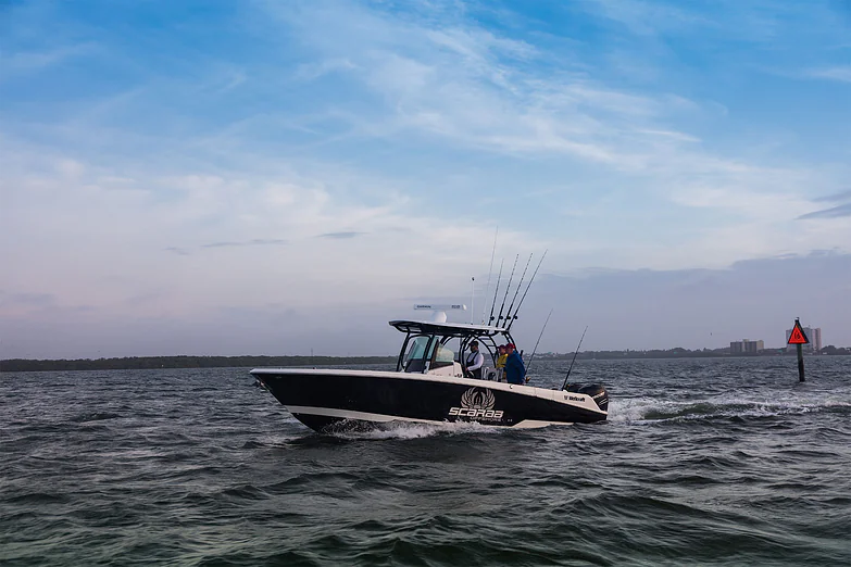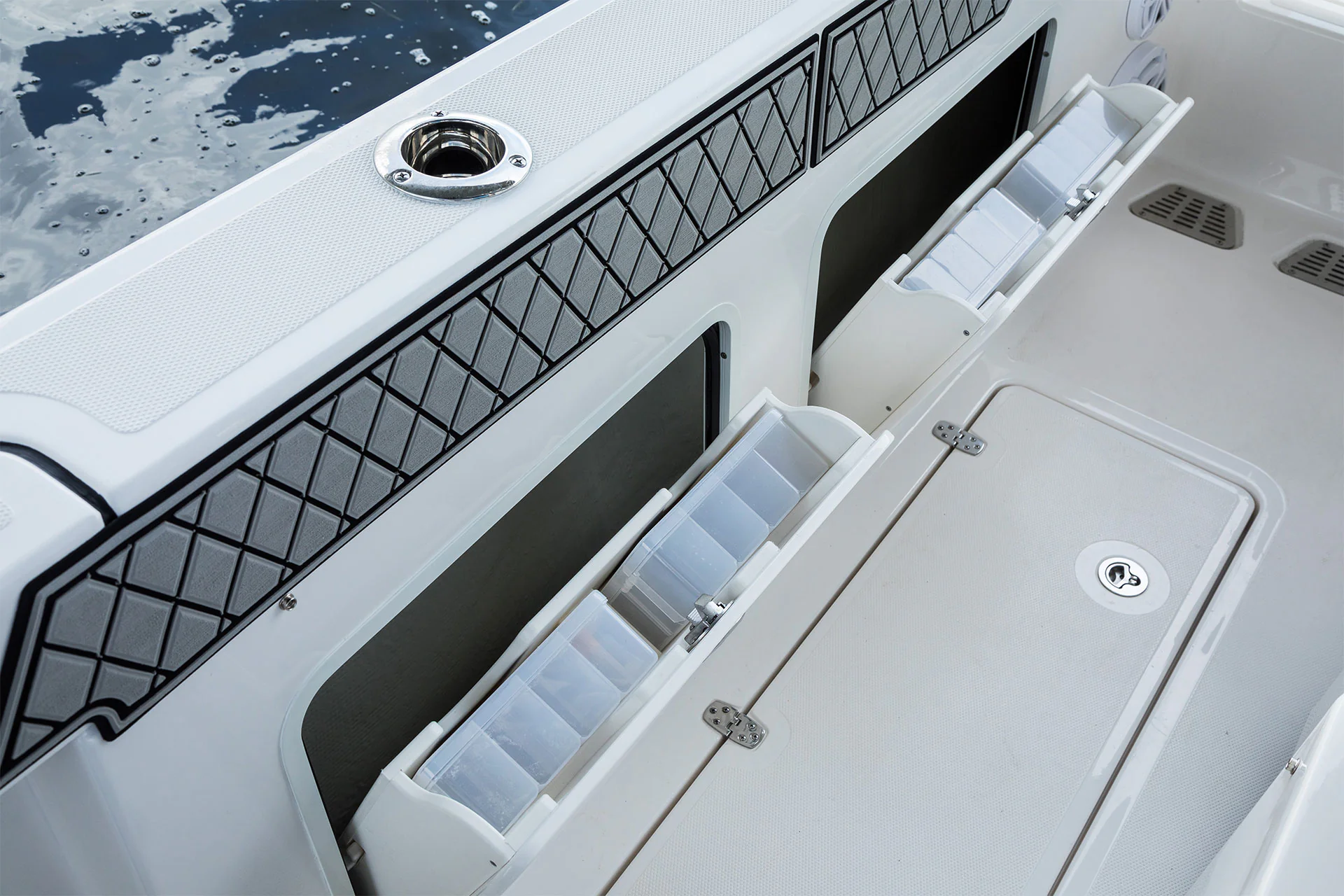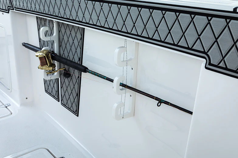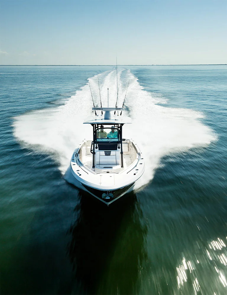 Inside the console, you’ll find secure storage, a marine head, and ergonomic helm seating for driving pleasure and control. The forward bow lounge transforms from an elevated 360° casting deck to a wrap-around seating/sun pad in seconds, creating a social space for family and friends. A port-side inward-opening dive door with ladder makes boarding effortless and brings big tuna aboard just as easily after a successful day offshore. Every detail is engineered for functionality, comfort, and adventure.