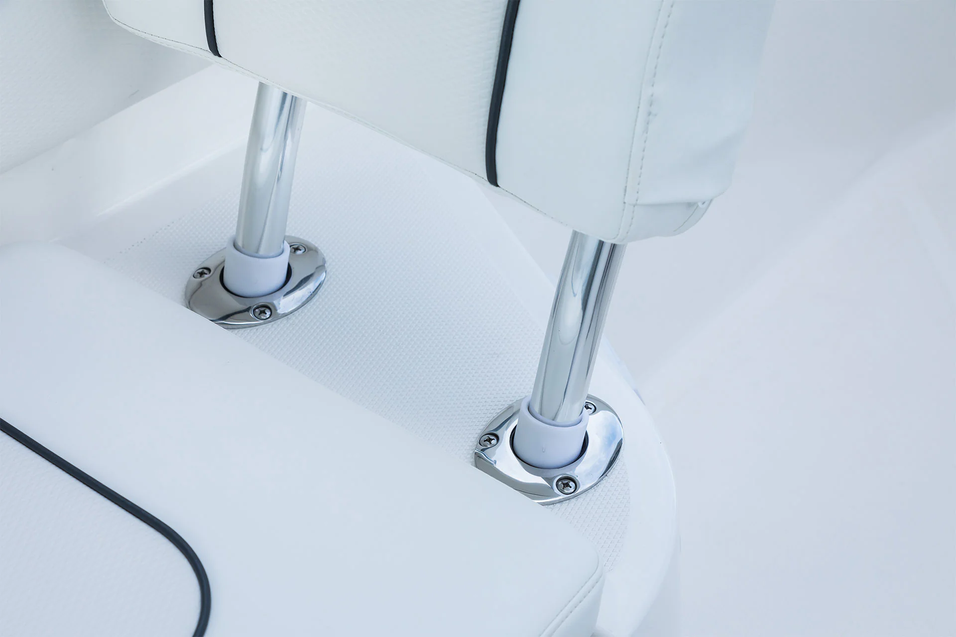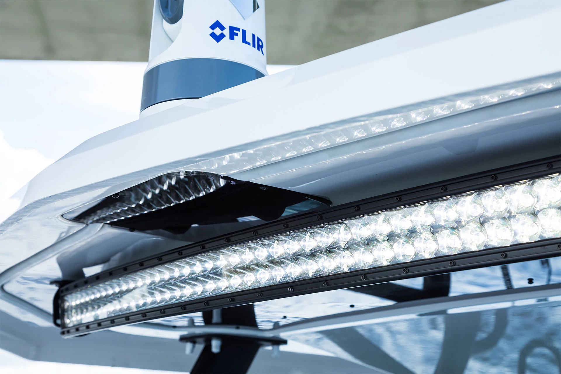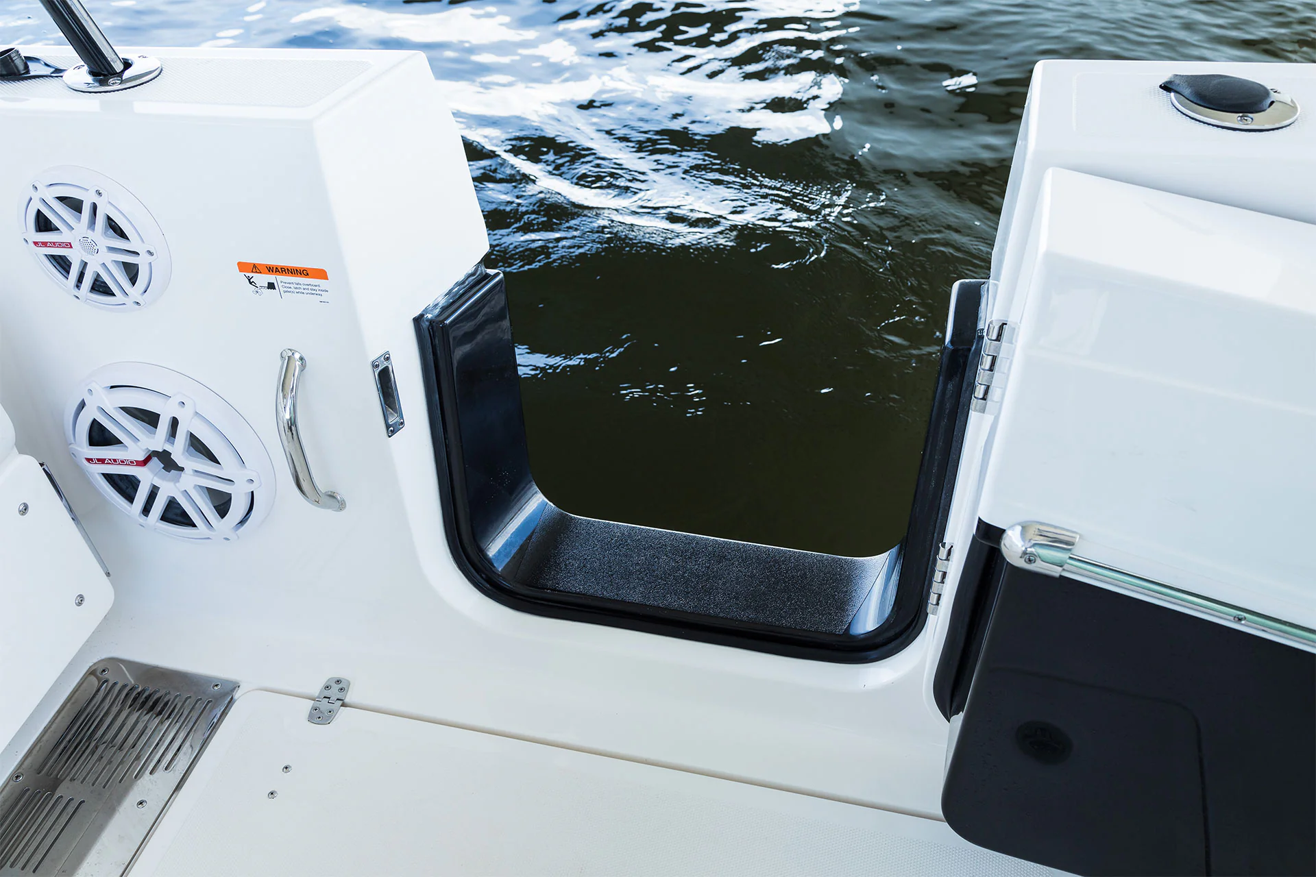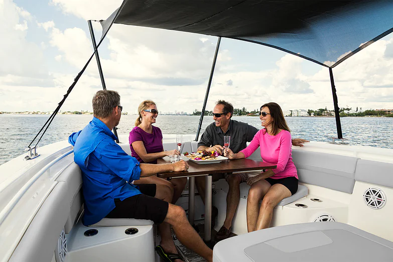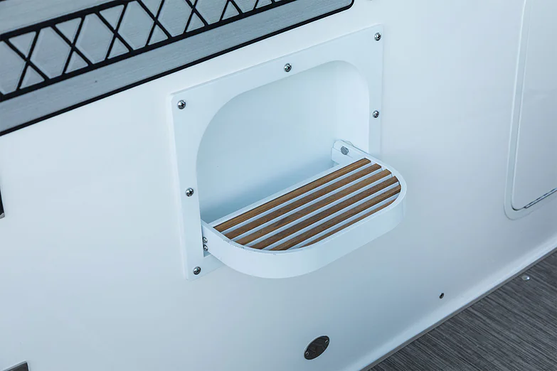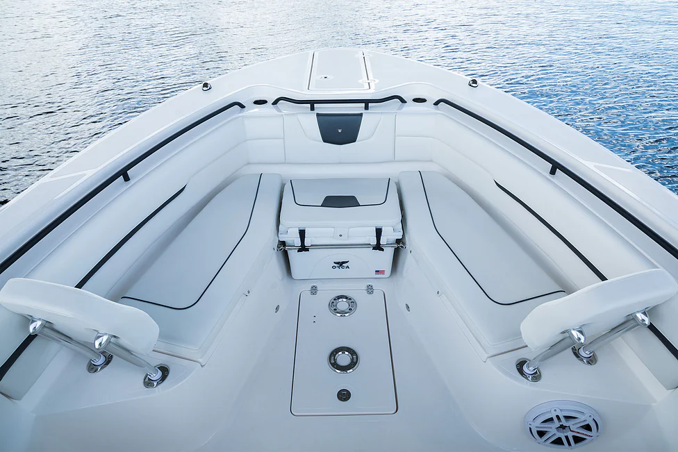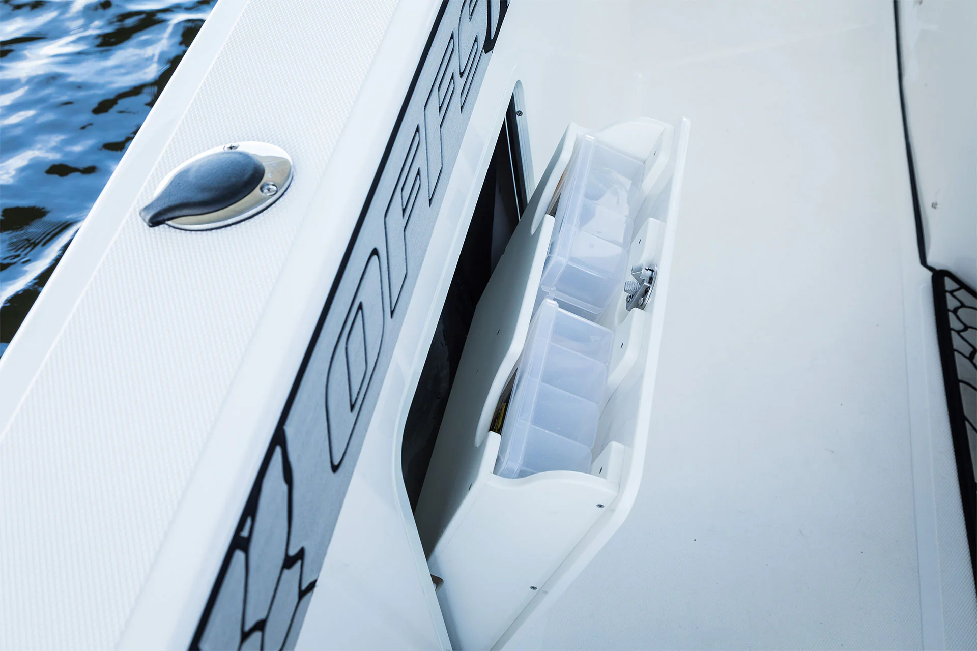 At the helm, three bolster bucket seats put you in command of optional dual 16″ Garmin displays and joystick piloting, delivering clear visibility, functional ergonomics, and pure driving pleasure in tough conditions. Forward, the bow lounge converts from a dinette to sunpad in seconds—exploration with family one day, offshore mission the next.