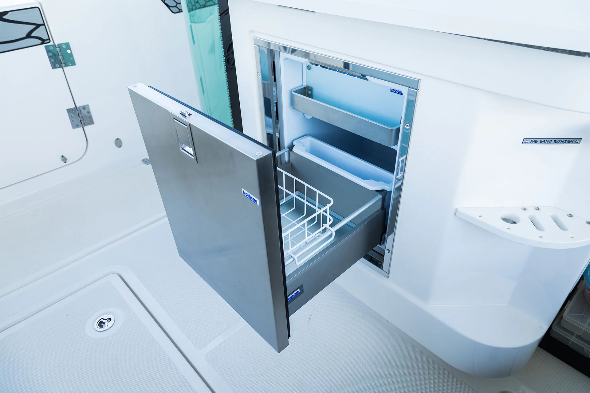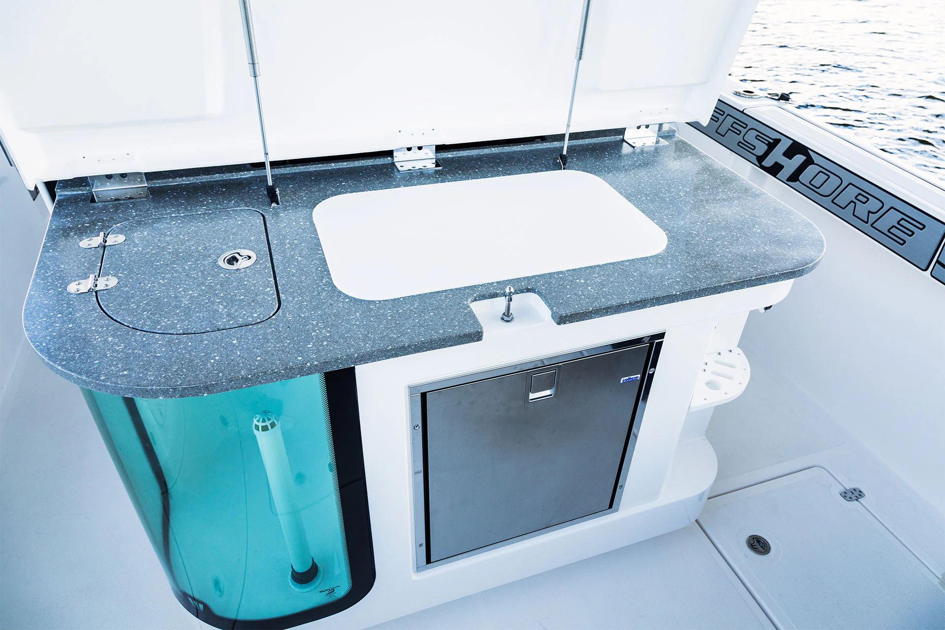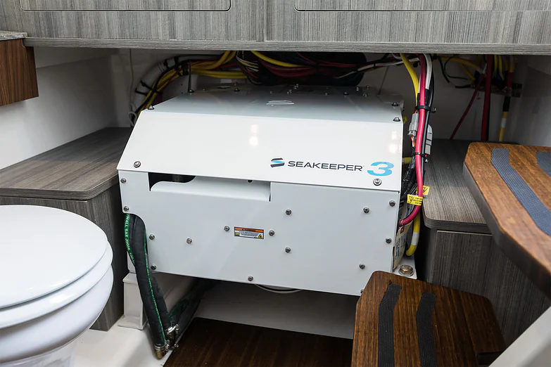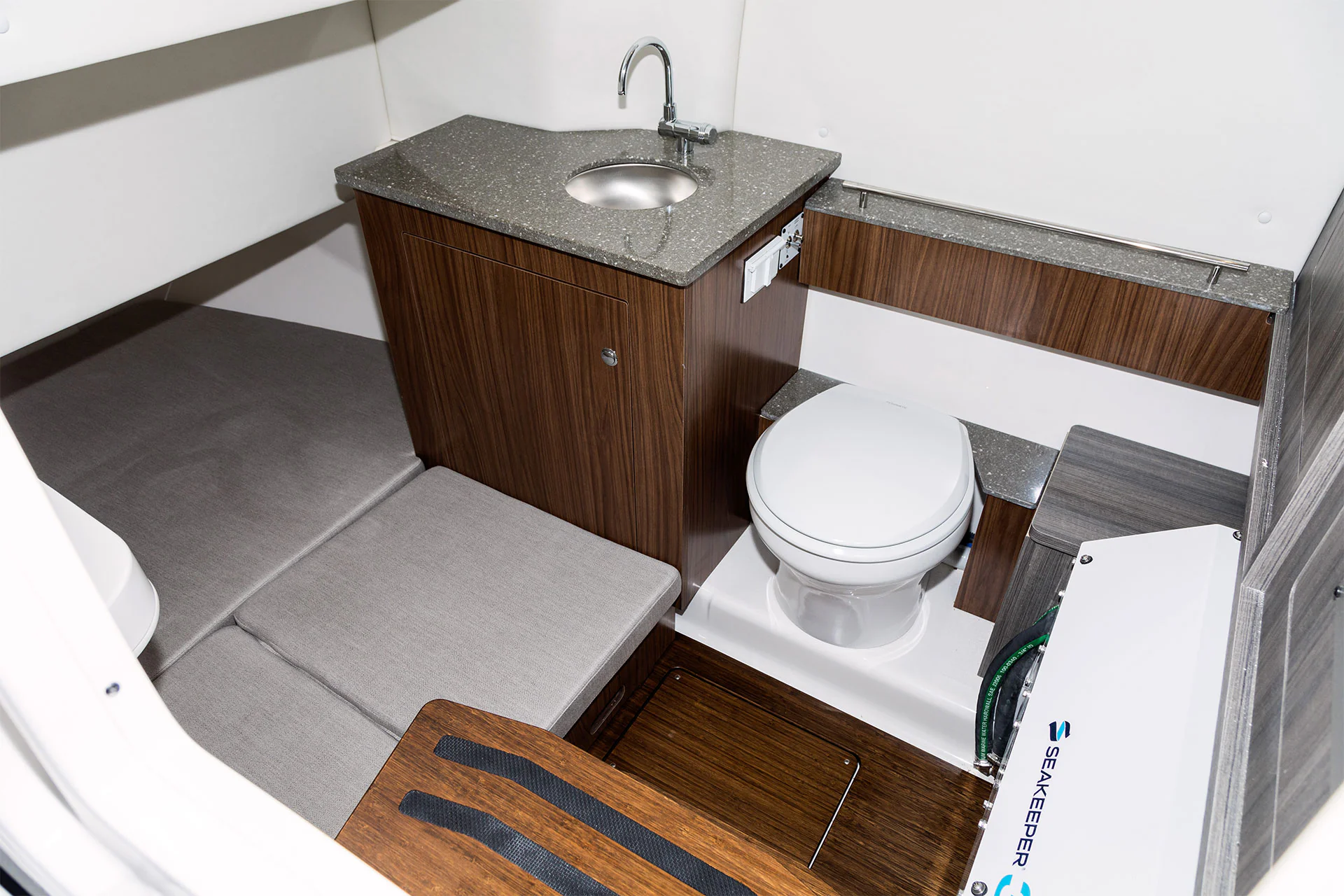 Under the stepdown console, a berth, sink, and electric head make long runs and light overnighting practical, while optional air conditioning powered by a 3.5 kW generator keeps the cabin comfortable during hot days. A dedicated bay for a Seakeeper 3 gyro underscores the Wellcraft 352 Fisherman big water intent.
