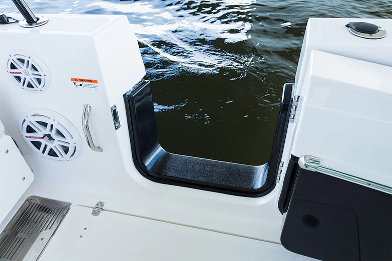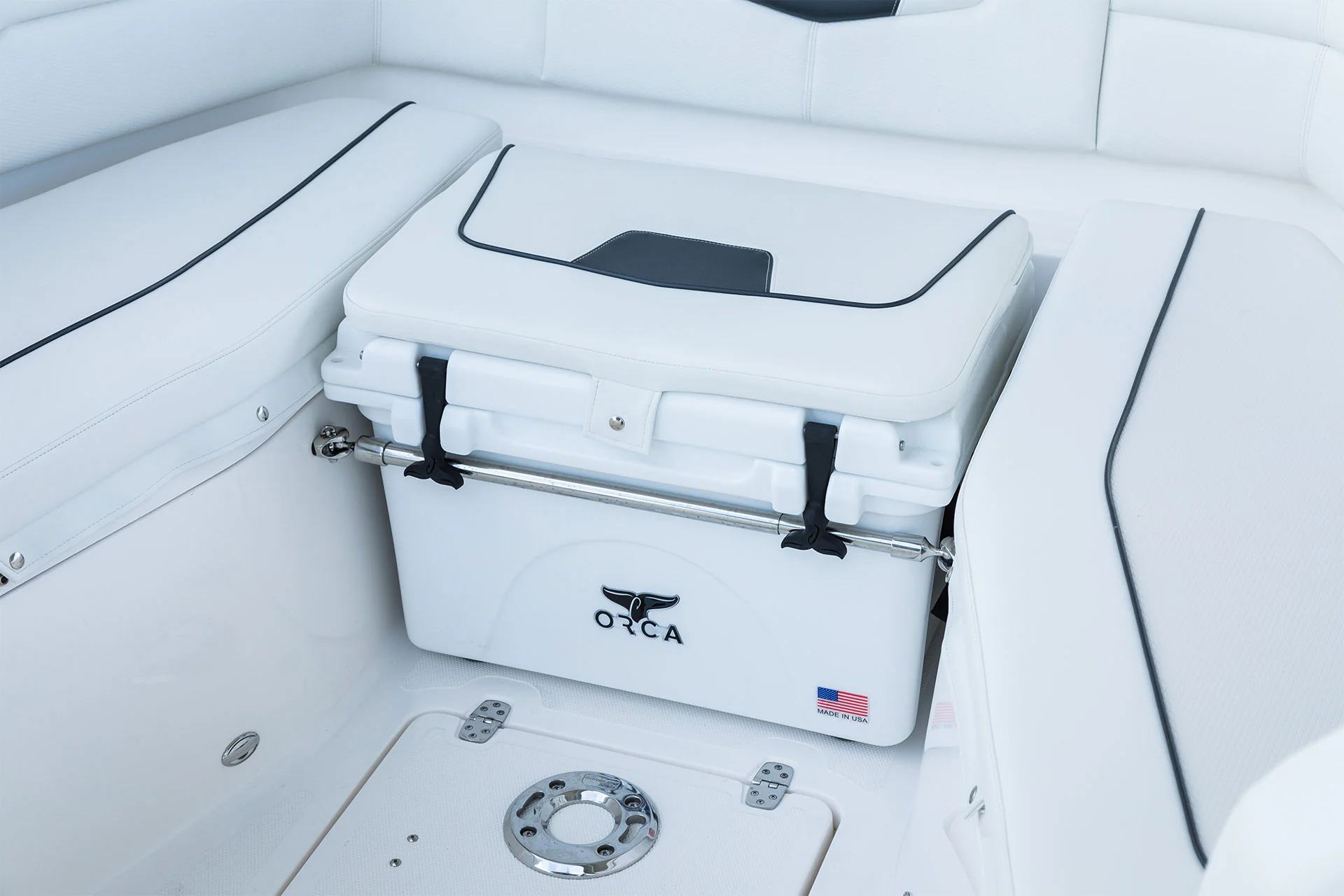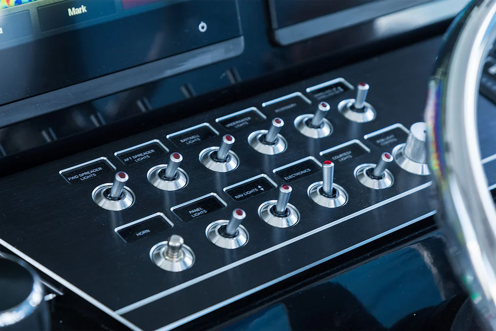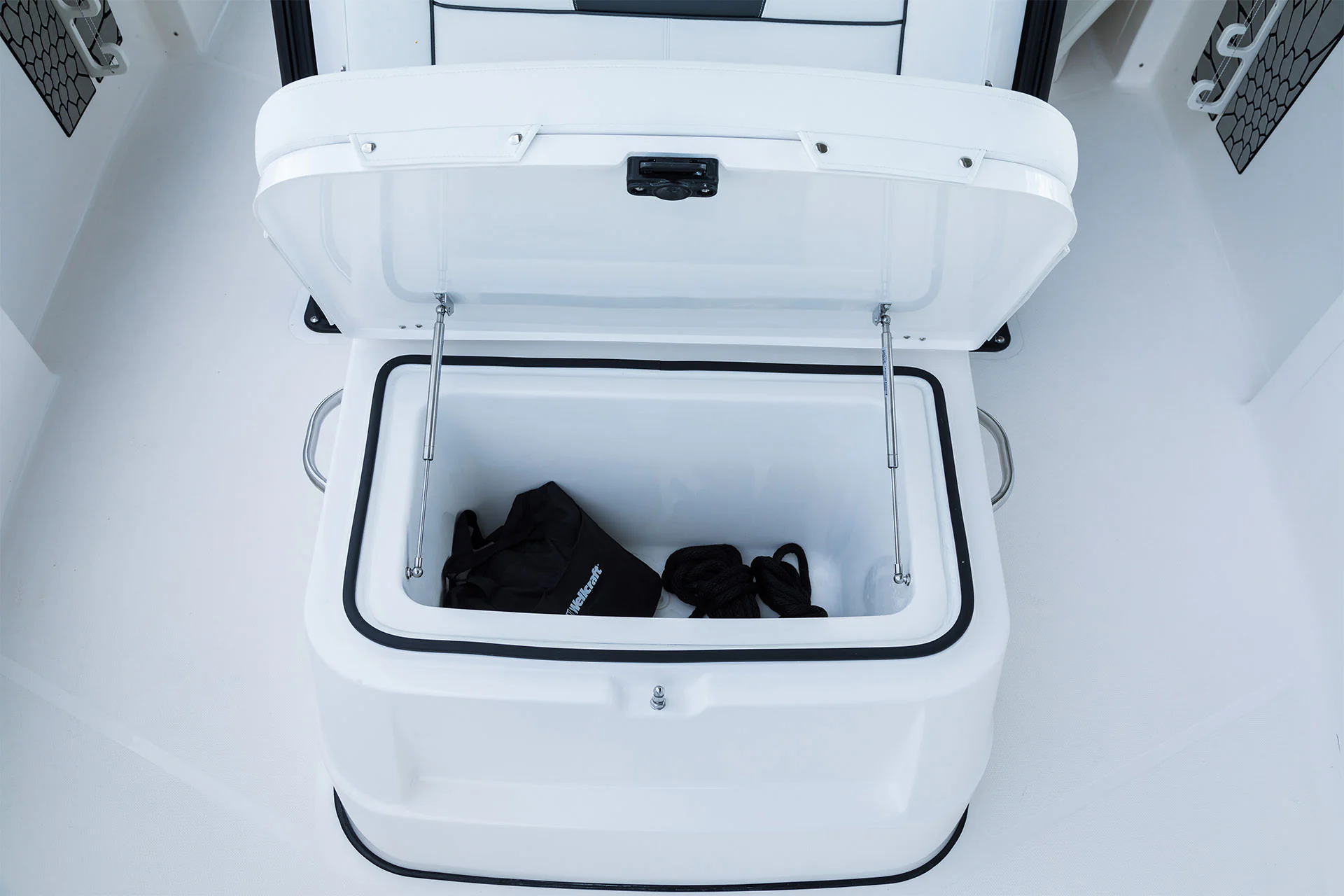 Under the stepdown console, a berth, sink, and electric head make long runs and light overnighting practical, while optional air conditioning powered by a 3.5 kW generator keeps the cabin comfortable during hot days. A dedicated bay for a Seakeeper 3 gyro underscores the Wellcraft 352 Fisherman big water intent.